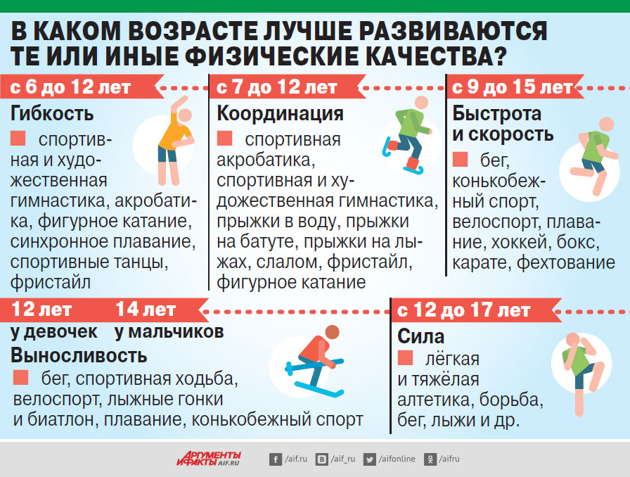Что нужно учитывать при выборе спортивной секции для ребенка Выбирая спортивную секцию для ребенка, конечно, в первую очередь нужно понять, какие варианты занятий есть в вашем городе или поселке. Для жителей больших городов будет актуальнее понять, какие секции находятся в шаговой доступности (до 30 минут пешком). Когда у вас на руках будет список всех возможных вариантов, можно переходить непосредственно к подбору секции для вашего ребенка. Идеально, если вы будете проводить подбор по нескольким критериям: желание ребенка. Может, у вашего сына или дочки уже есть мечта освоить определенный вид спорта? Спросите кроху и возможно выбирать не придется. возраст ребенка. Принимает ли секция детей возрастной категории вашего карапуза; пол крохи. Большинство секций производит набор детей обоих полов, но иногда в рамках конкретной спортивной школы могут быть ограничения на набор мальчиков или девочек определенного возраста. Также нужно учитывать сугубо женские (синхронное плавание, художественная гимнастика, софтбол) и мужские (регби, бейсбол) виды спорта; медицинские противопоказания. У каждого вида спорта существуют противопоказания по здоровью. Хорошо еще на этапе выбора отбросить все неподходящие по состоянию здоровья варианты; темперамент малыша. Холерики, сангвиники, флегматики и меланхолики — дети разные, их темперамент во многом обуславливает успешность посещения секции; телосложение. Вряд ли секция сумо подойдет худенькому, долговязому мальчику, а коренастого крепыша могут не взять на спортивную гимнастику; тренер и оборудование. Посетите оставшиеся варианты, познакомьтесь с тренером, его принципами обучения, опытом. Посмотрите, где проходят занятия, какая у секции база, инвентарь. финансовый вопрос. Некоторые виды спорта требуют существенного финансирования со стороны родителей. До начала посещения обязательно оцените свои возможности, рассчитав примерные затраты на спортивную секцию в год. Оценив список секций, находящихся в шаговой доступности, по этим критериям, вы найдете идеально подходящий вариант для вашего ребенка. Давайте подробнее остановимся на том, как подбирать секцию по этим критериям. Возраст ребенка В зависимости от вида спорта секции производят набор детей в разном возрасте. Следует понимать, что по законодательству обучение детей до 6 лет происходит только через игровые приемы, исключает изучение сложных техник и упражнений, должно соответствовать психическому и физическому развитию детей определенного возраста.